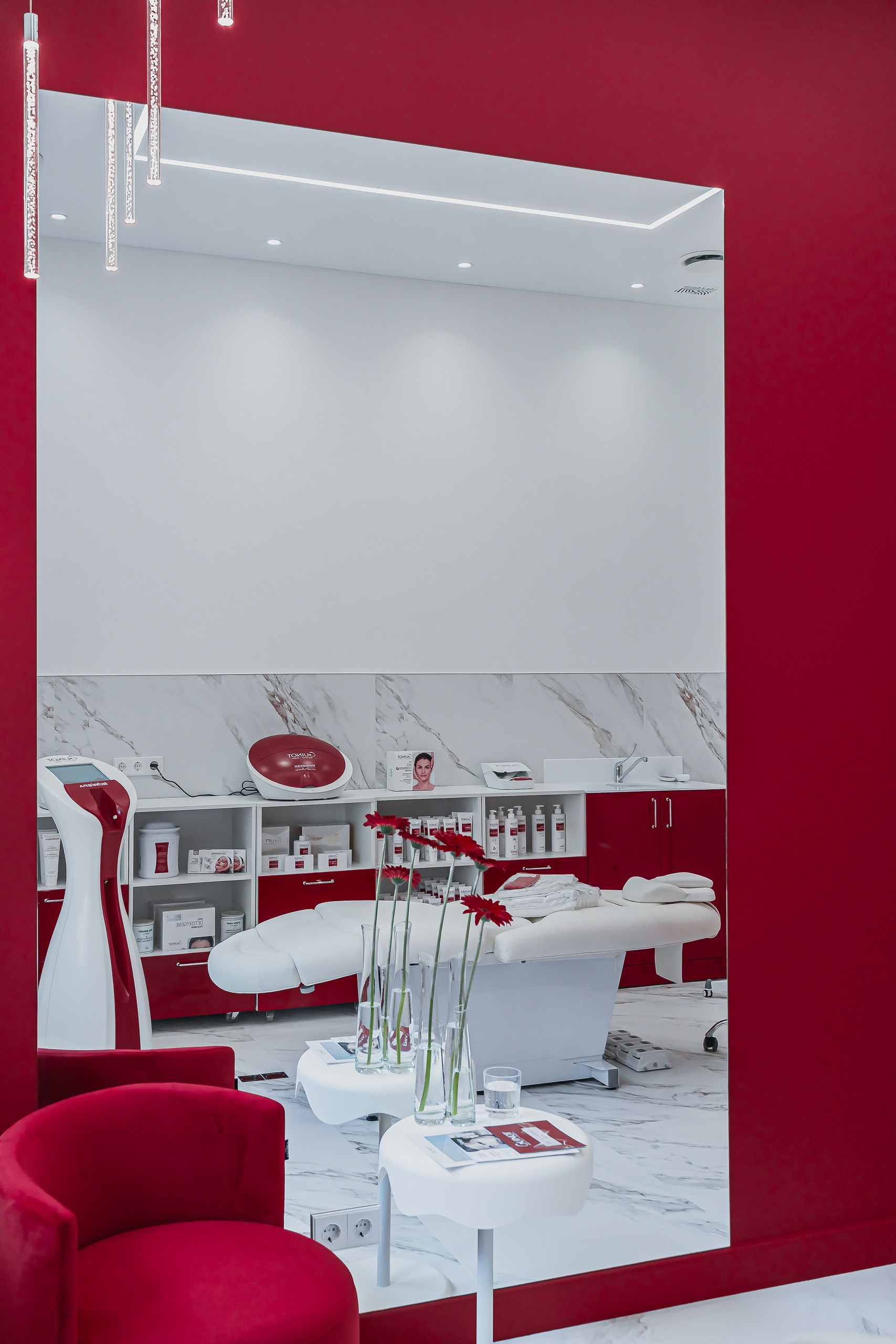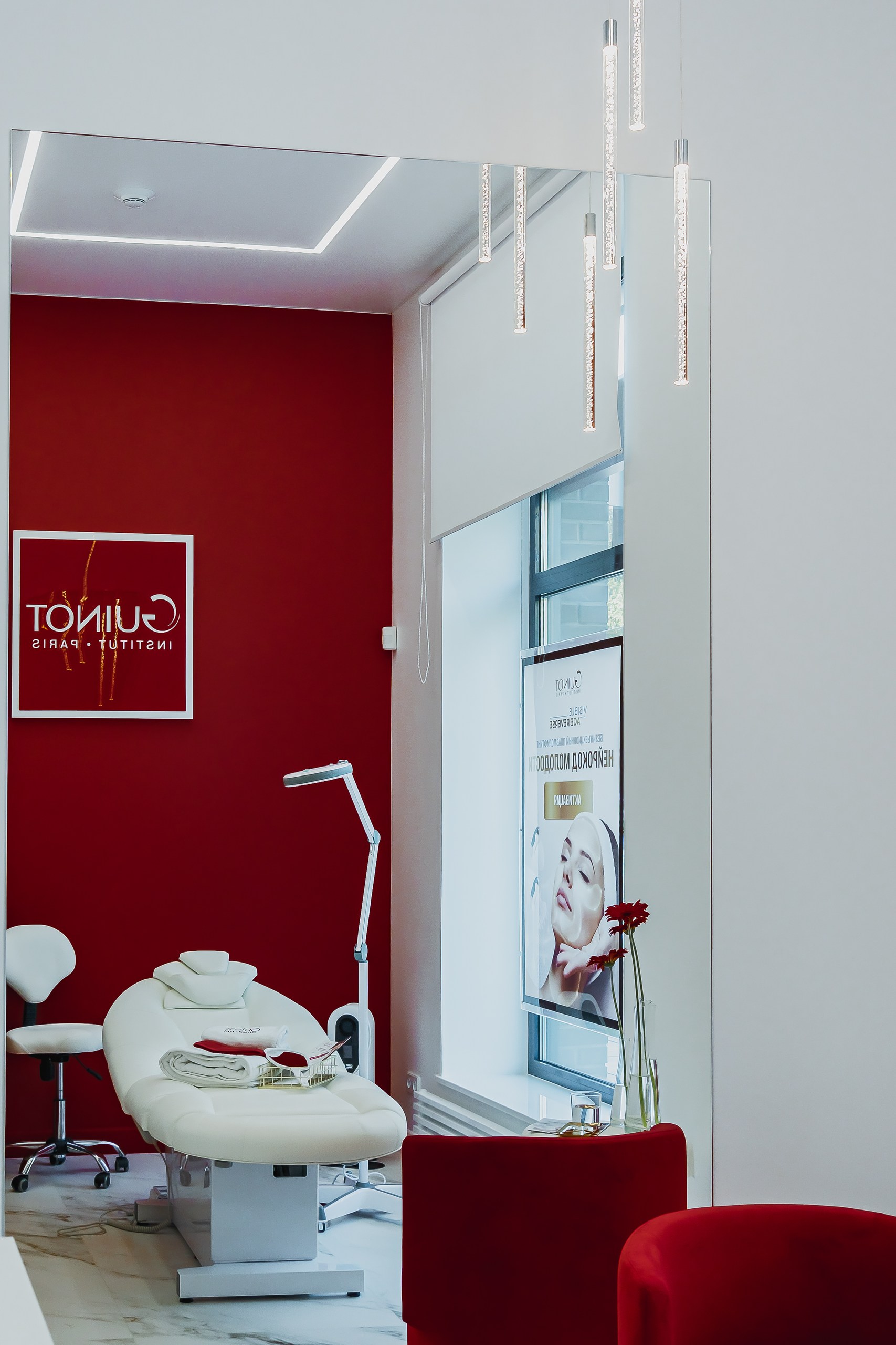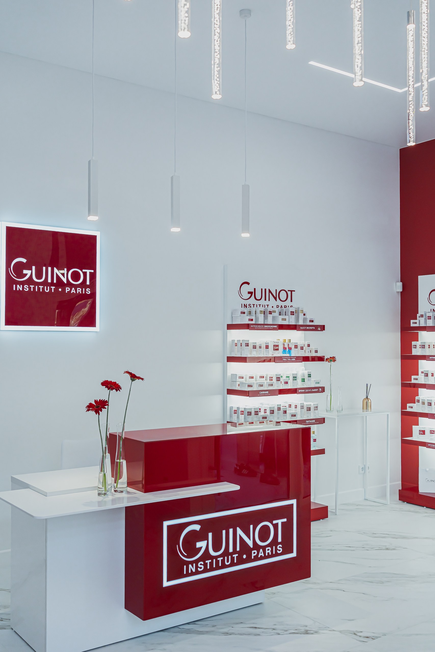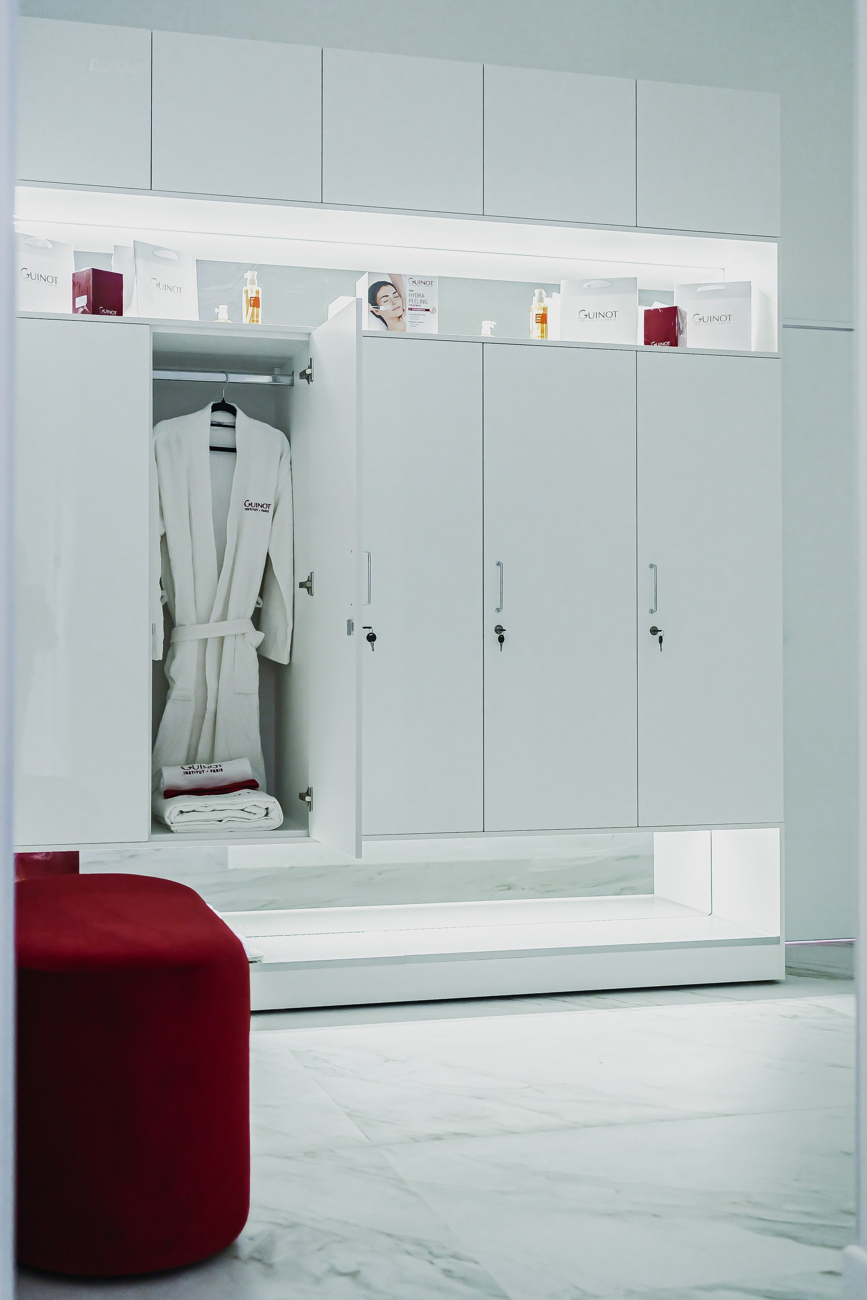 Для клиники «GUINOT» использовали различные типы освещения. Подсветка полок и потолка со светодиодной лентой, точечные светильники и декоративный свет для расстановки визуальных акцентов и создания атмосферы.
