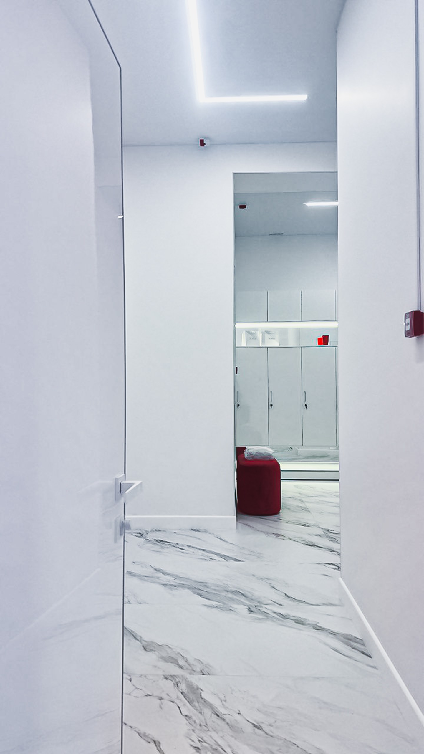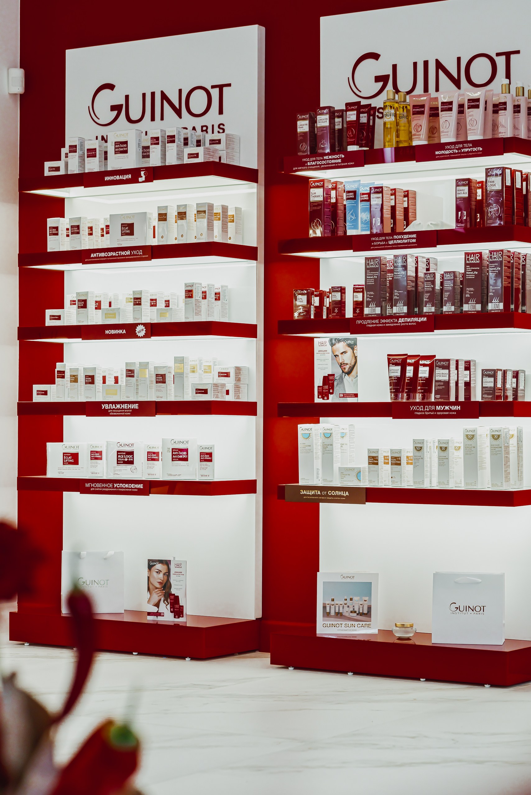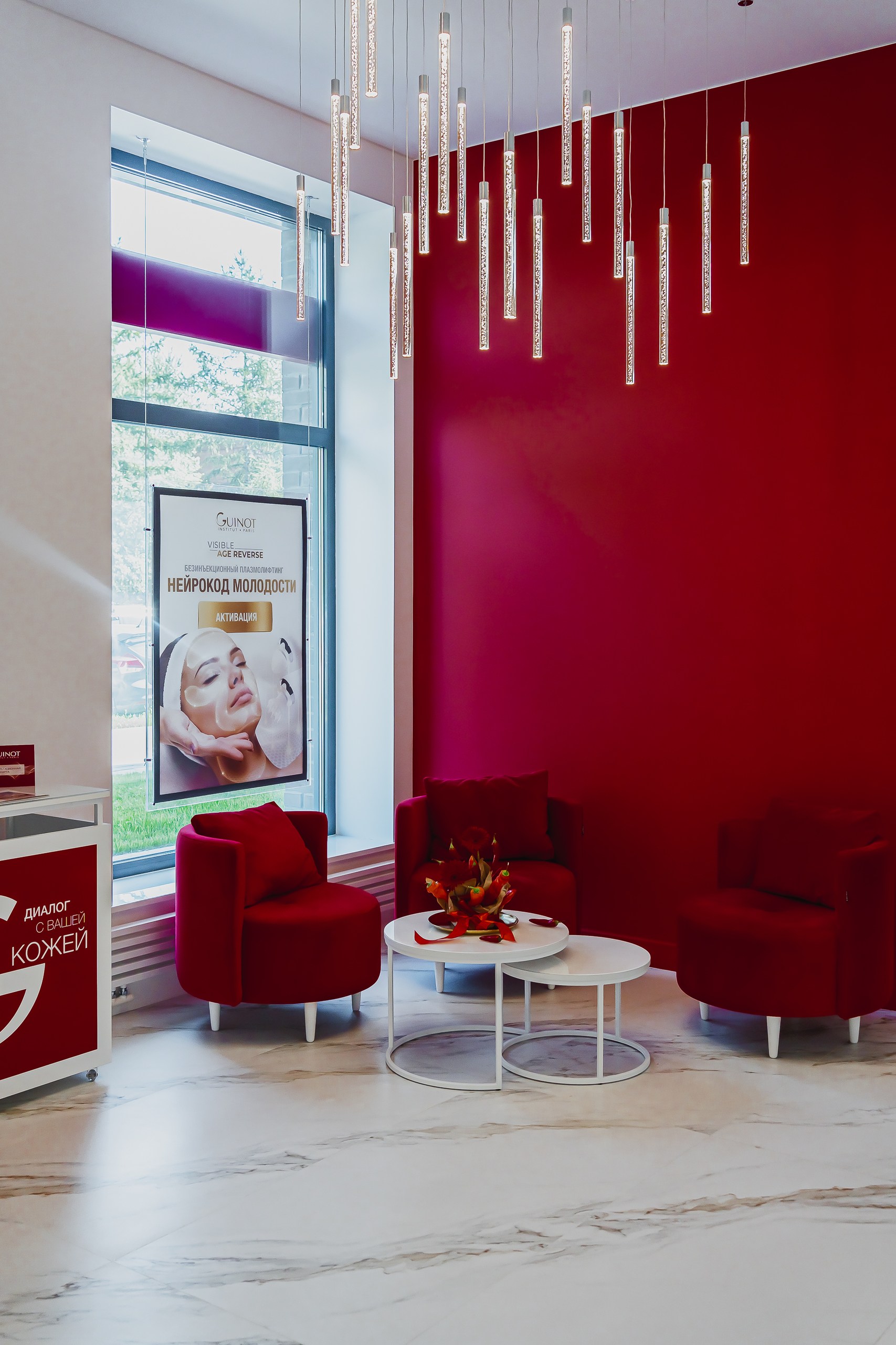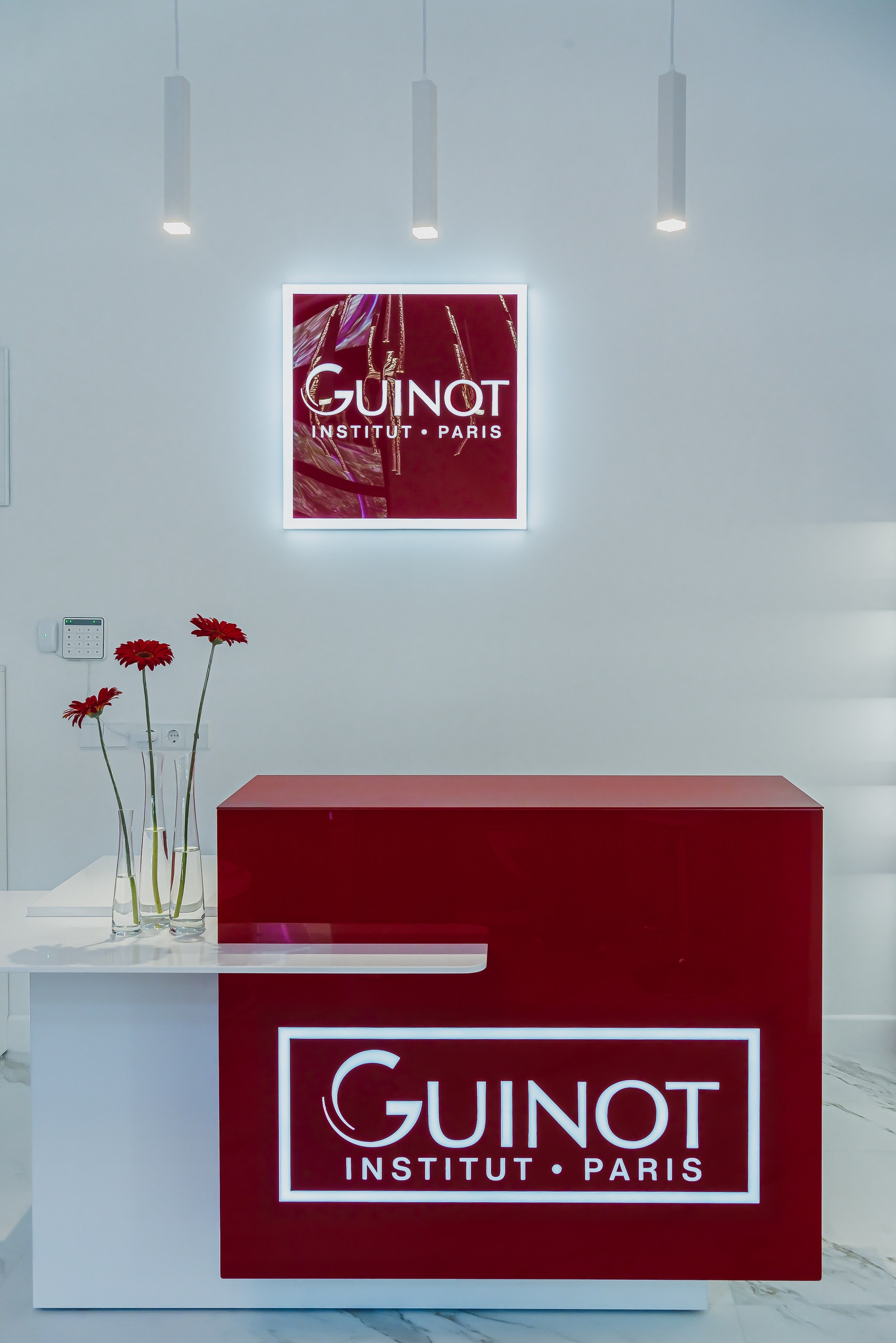Для клиники «GUINOT» использовали различные типы освещения. Подсветка полок и потолка со светодиодной лентой, точечные светильники и декоративный свет для расстановки визуальных акцентов и создания атмосферы.