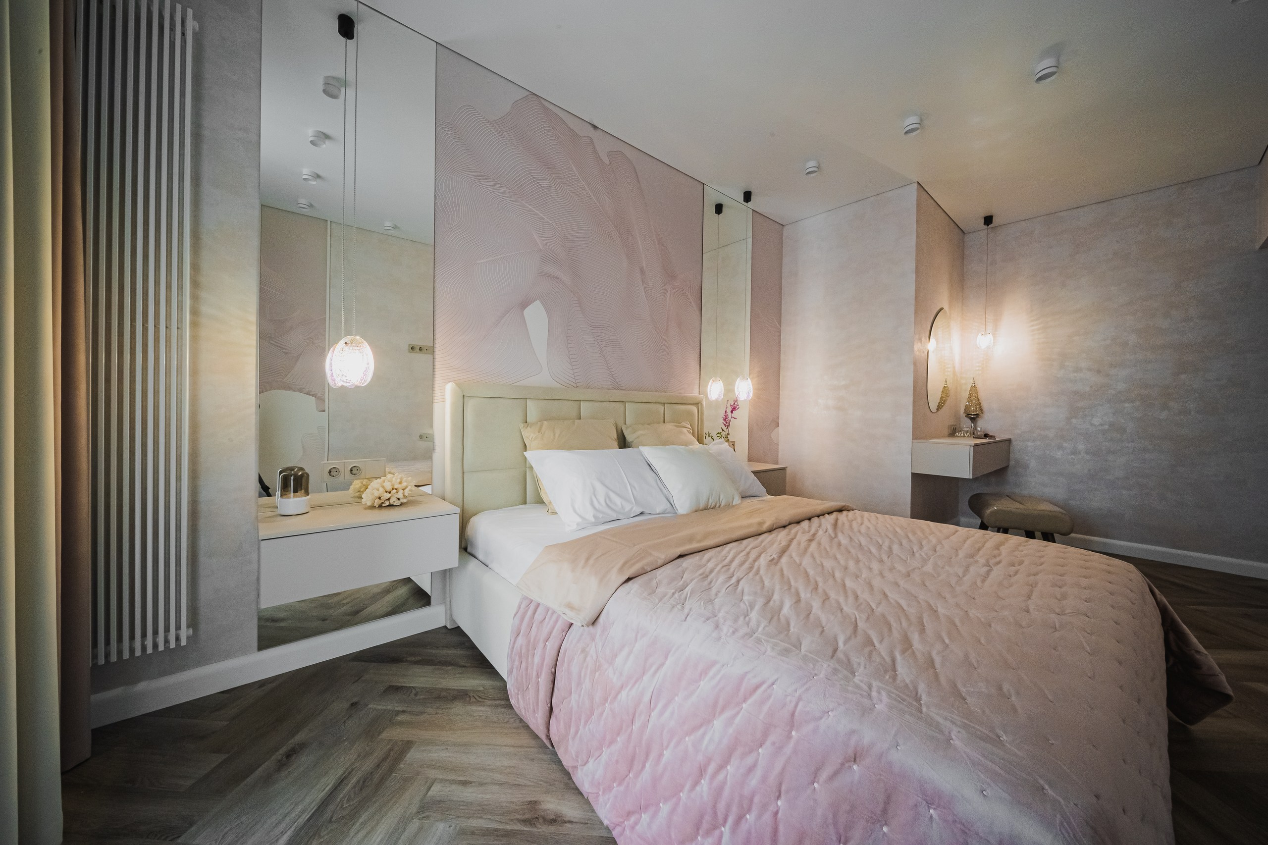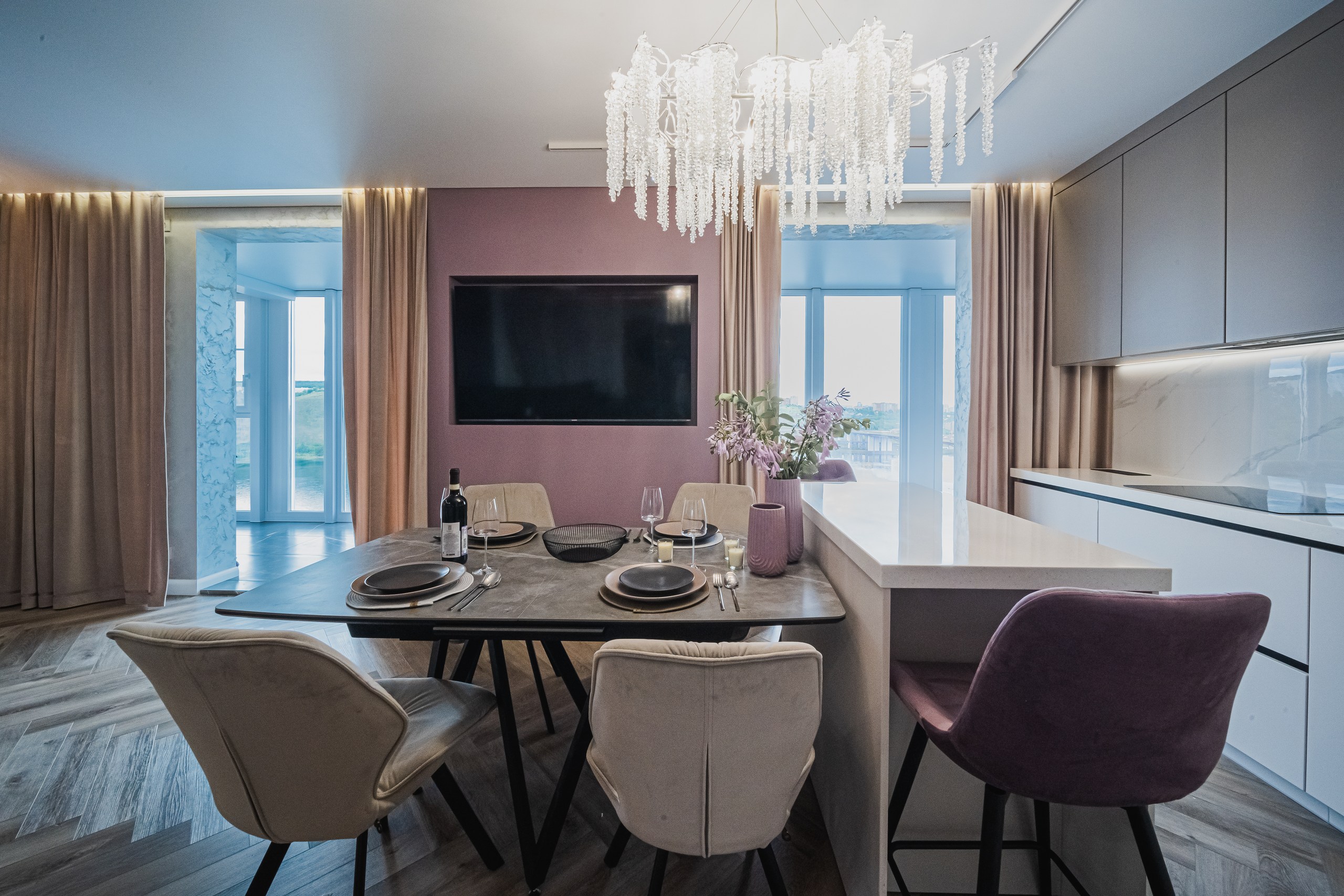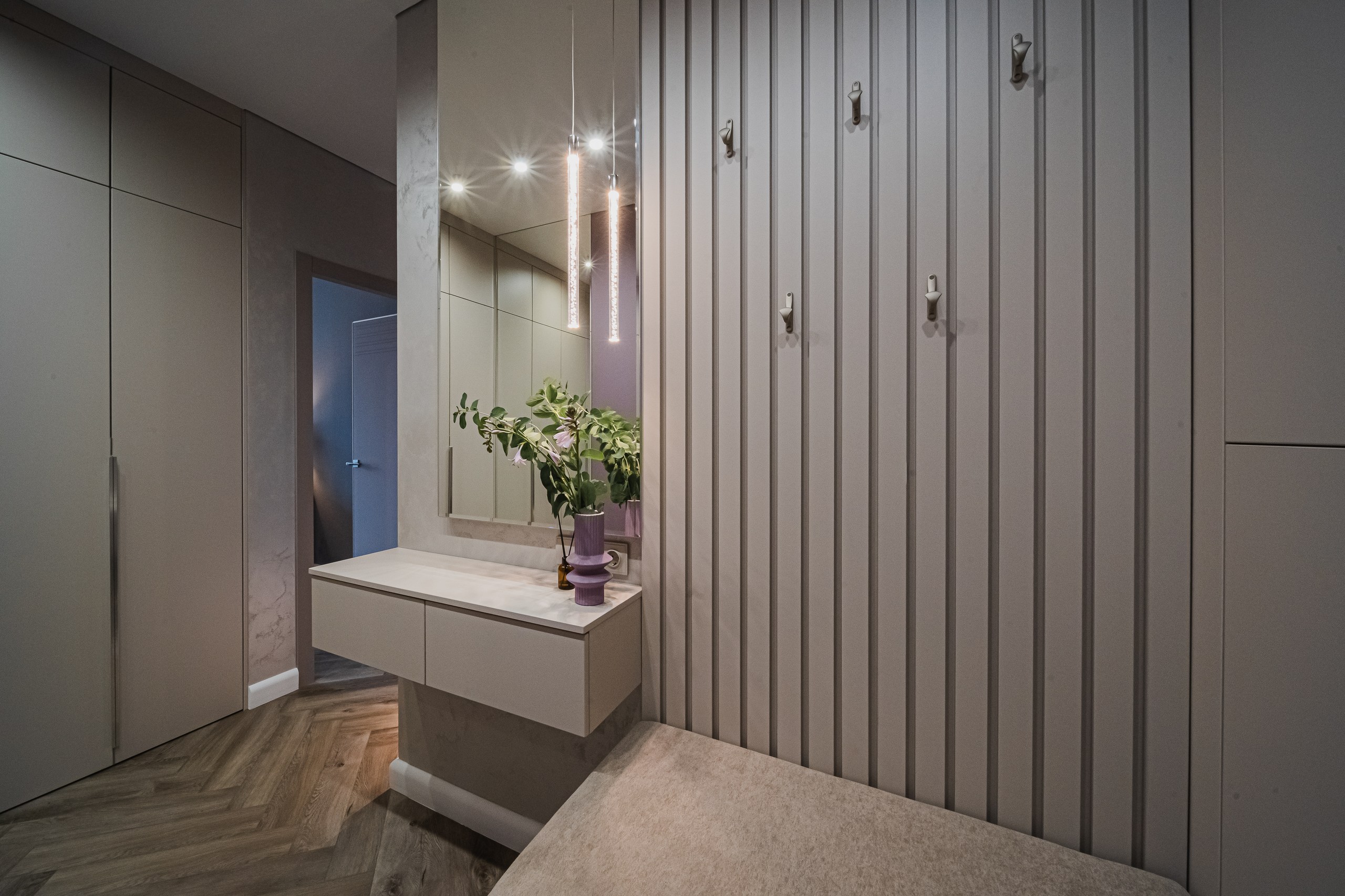 В просторной квартире дизайнер Мария Шумарина использовала сочетание функционального освещения с декоративным. В качестве основного света использовали трековые системы OPTIMA от ARTE Lamp и накладные светильники FANG и IMAI, а визуальными акцентами служат декоративные светильники в стиле современной классики.