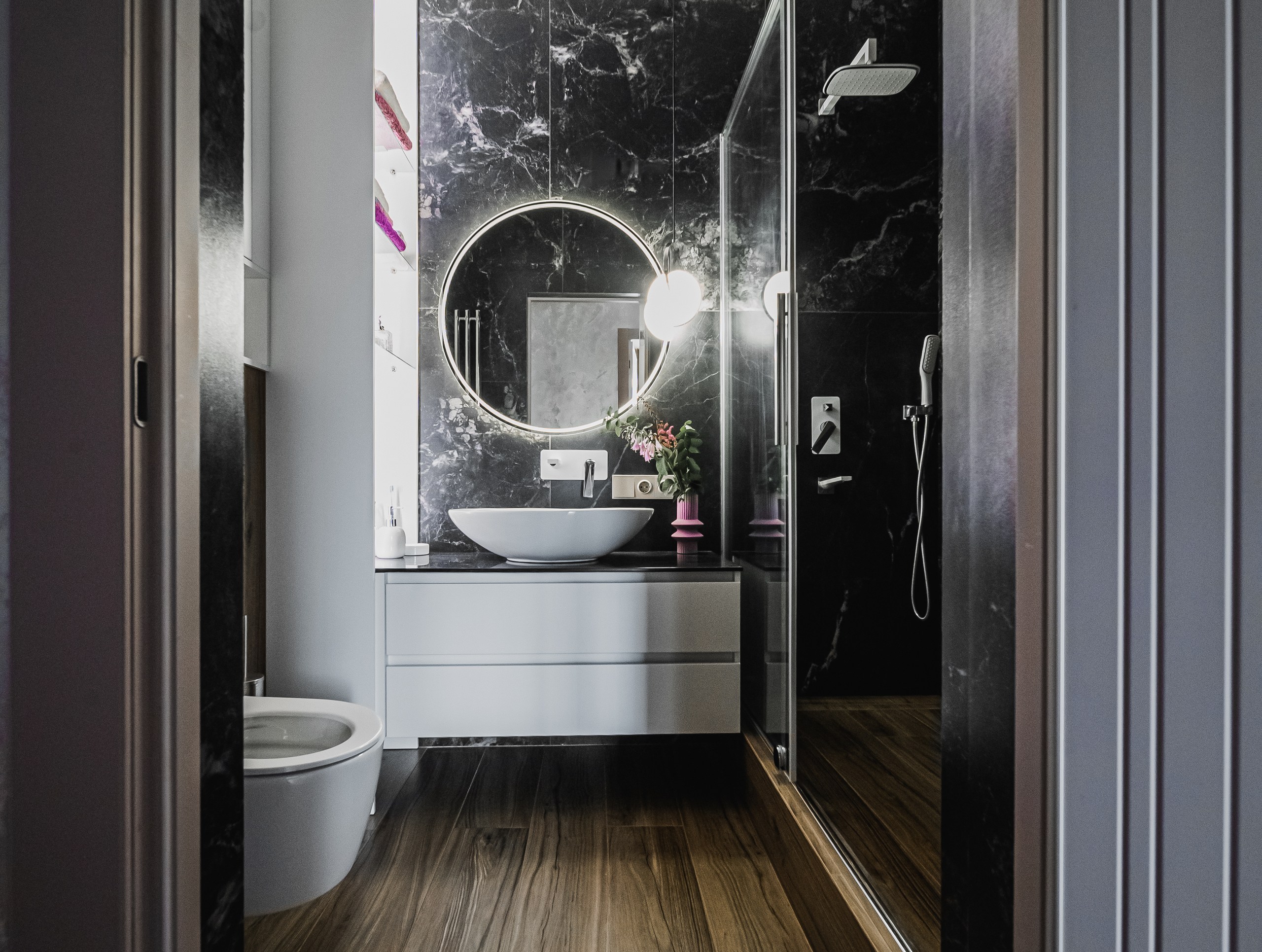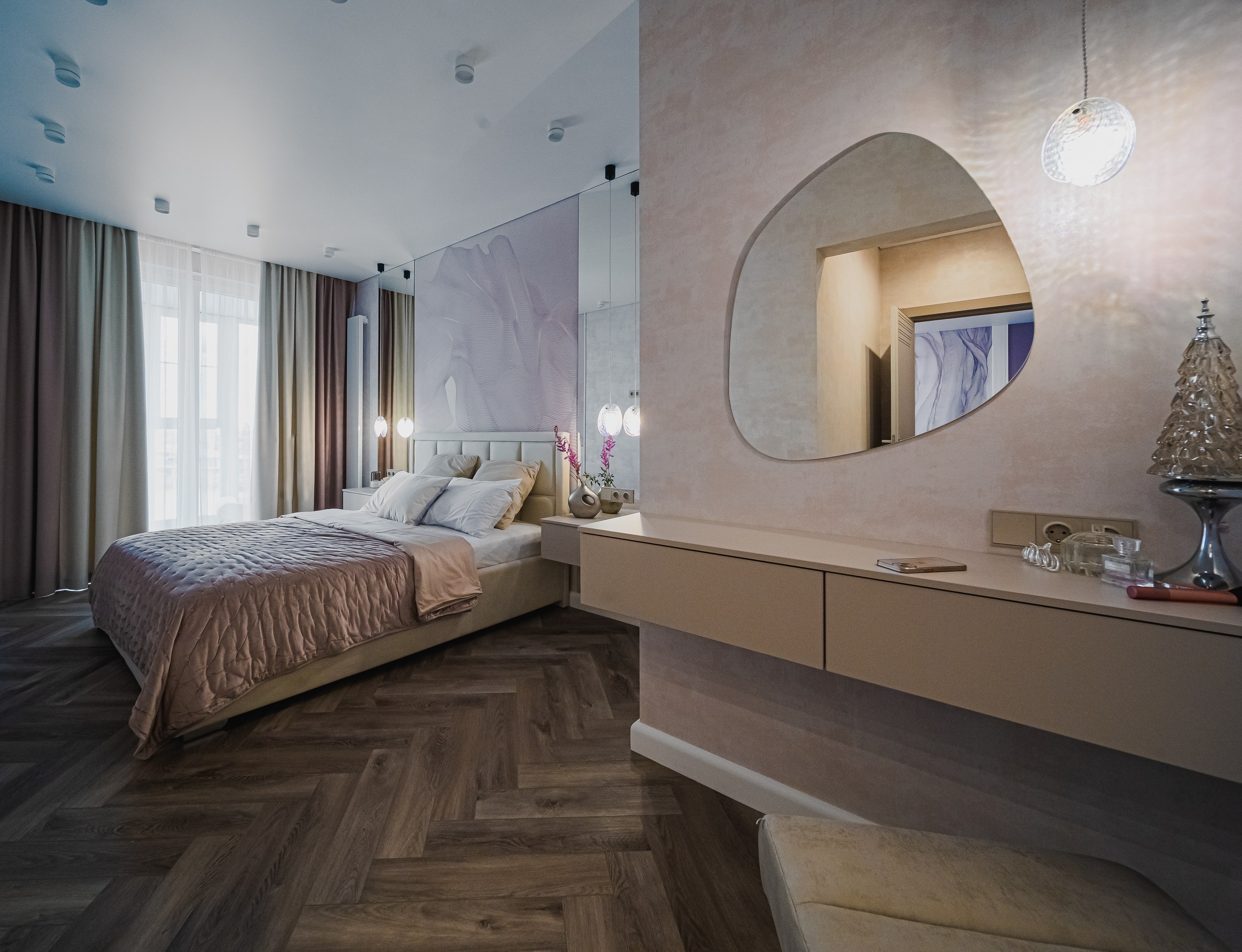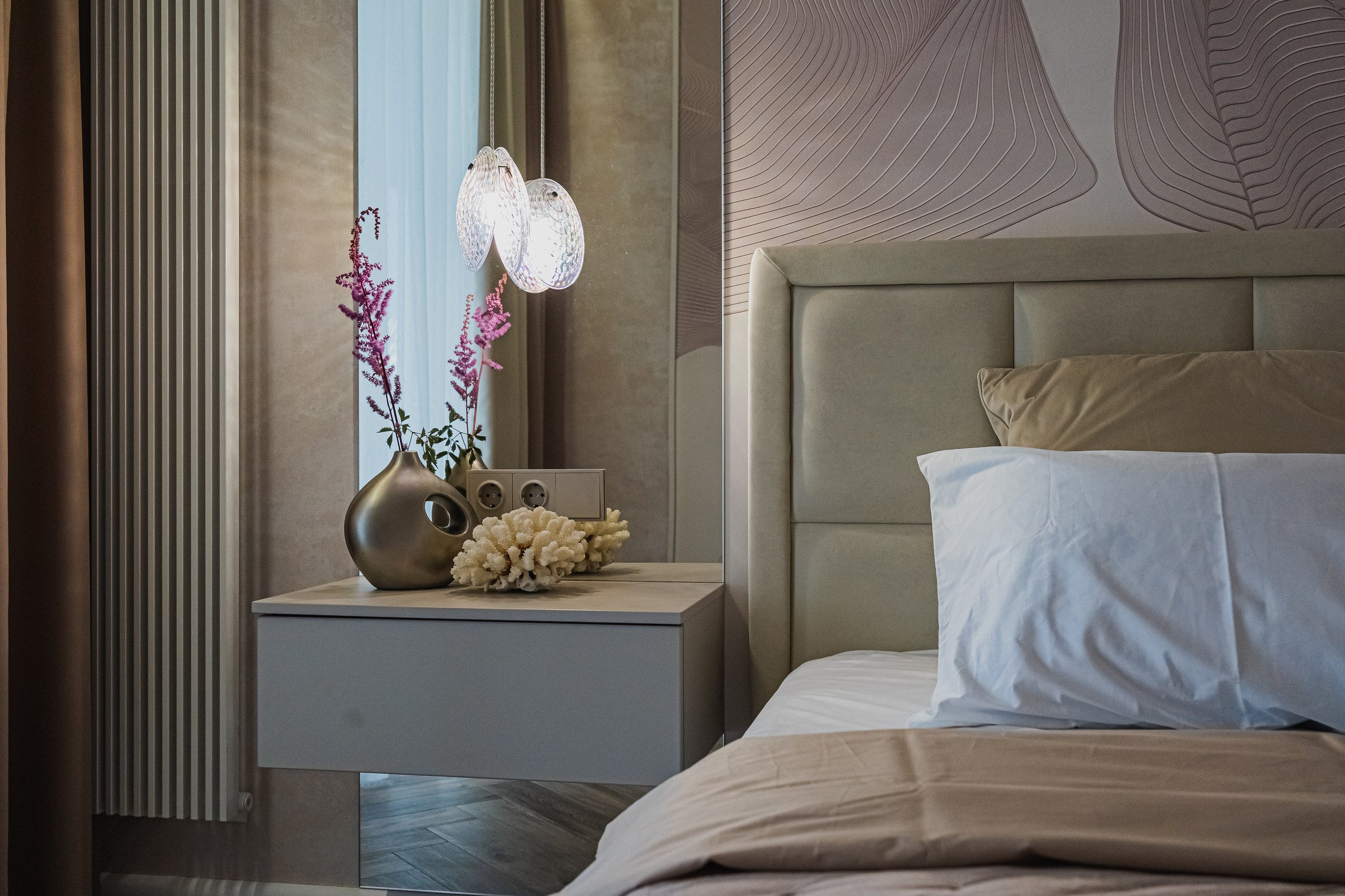 В просторной квартире дизайнер Мария Шумарина использовала сочетание функционального освещения с декоративным. В качестве основного света использовали трековые системы OPTIMA от ARTE Lamp и накладные светильники FANG и IMAI, а визуальными акцентами служат декоративные светильники в стиле современной классики.