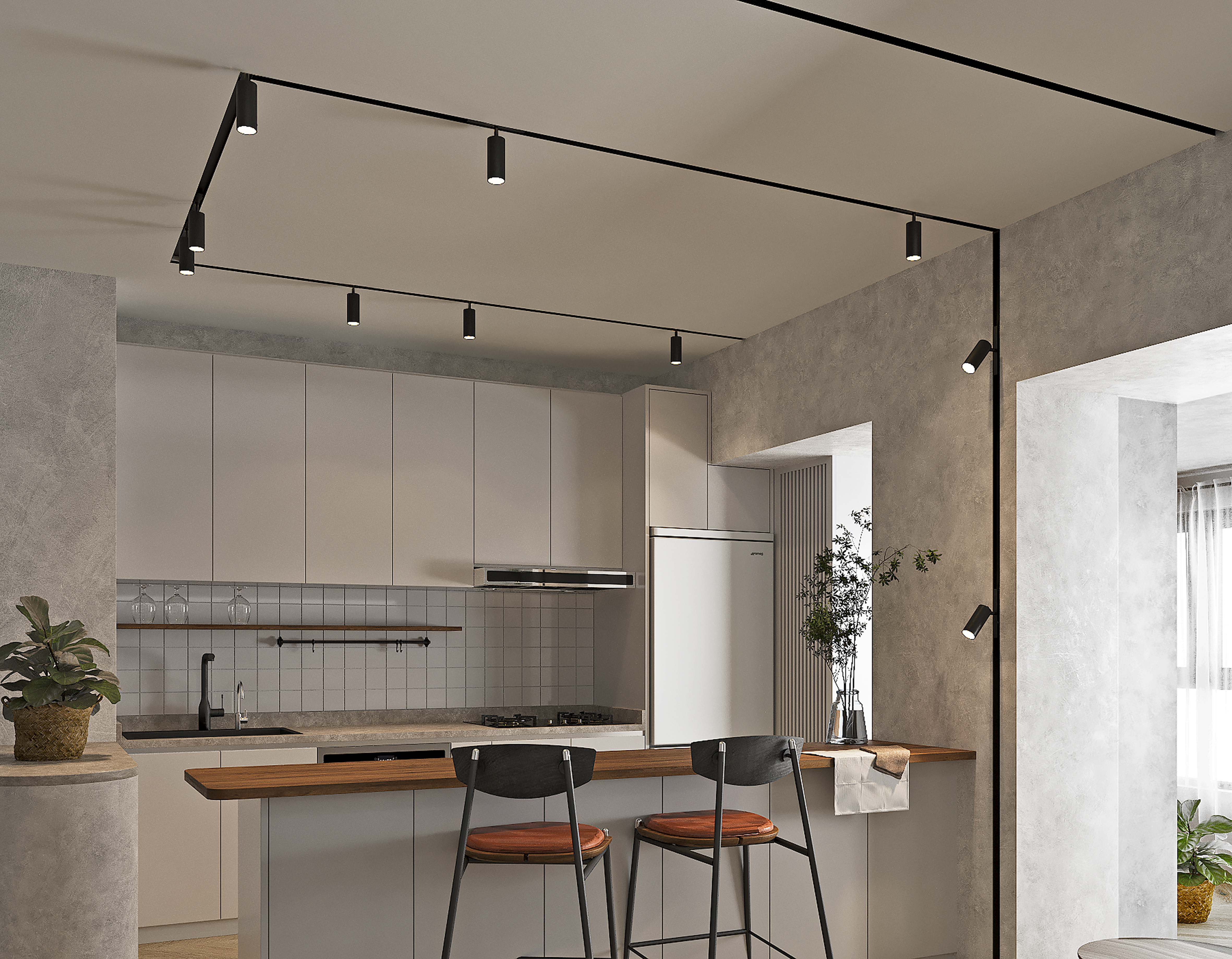 Теперь о месте установки. Трековые светильники идеально подходят для потолков с высотой более 2,5 метров. Если вы живете в "Хрущёвке", вам лучше сначала наклонить голову, а потом уже думать о трековом освещении. Постарайтесь выбрать место, где они смогут освещать нужные зоны — например, над столом или в гостиной.