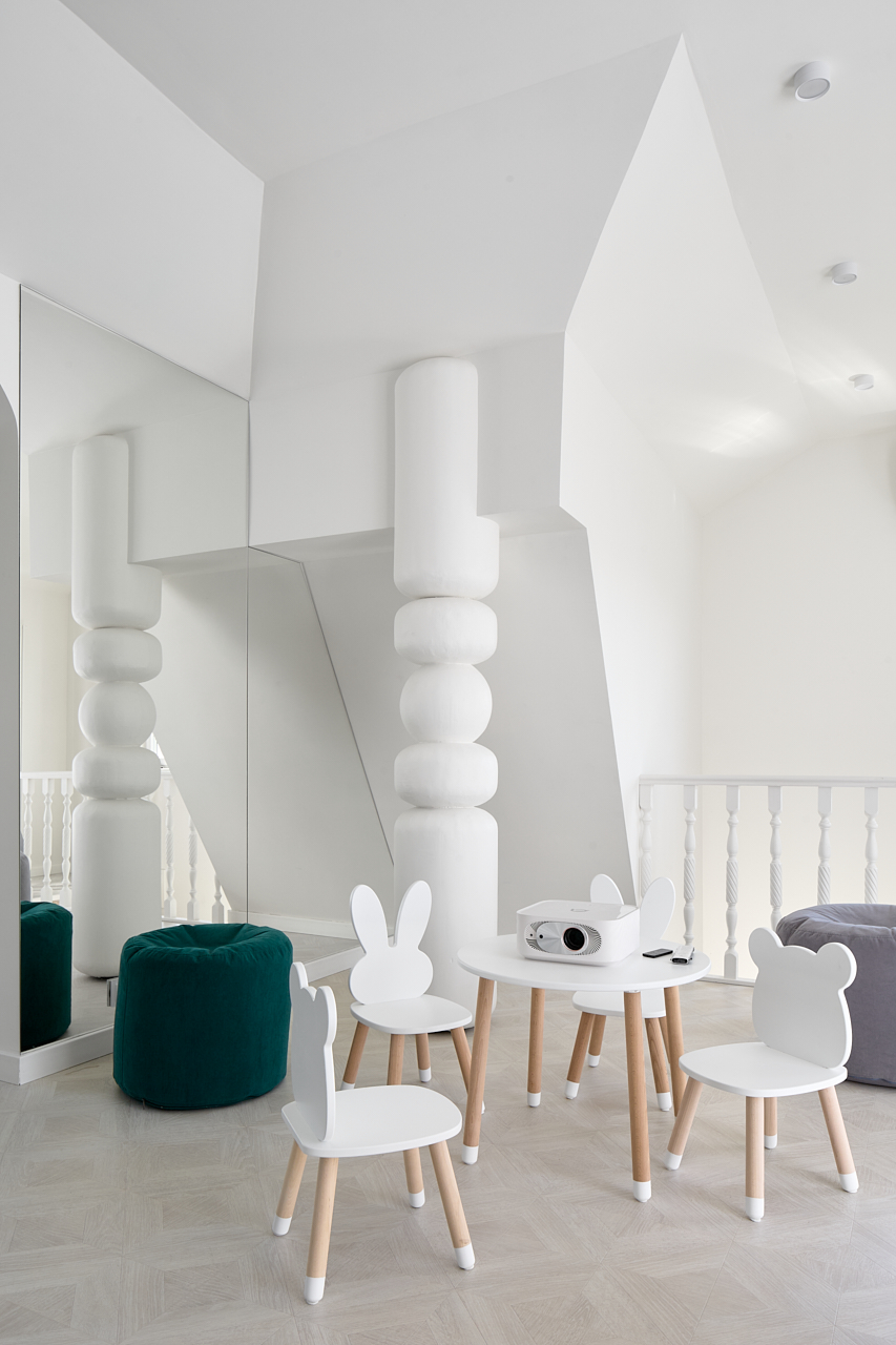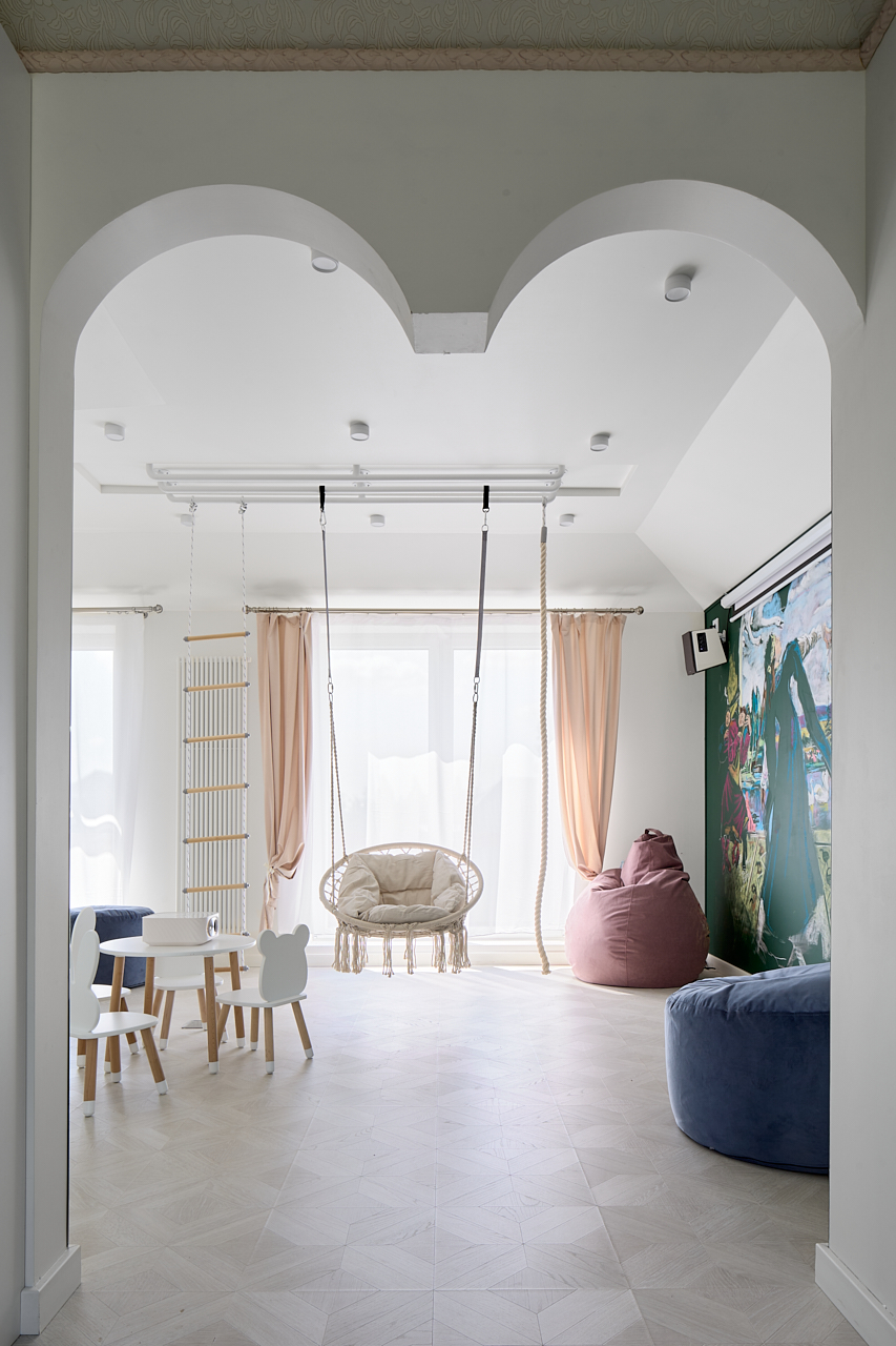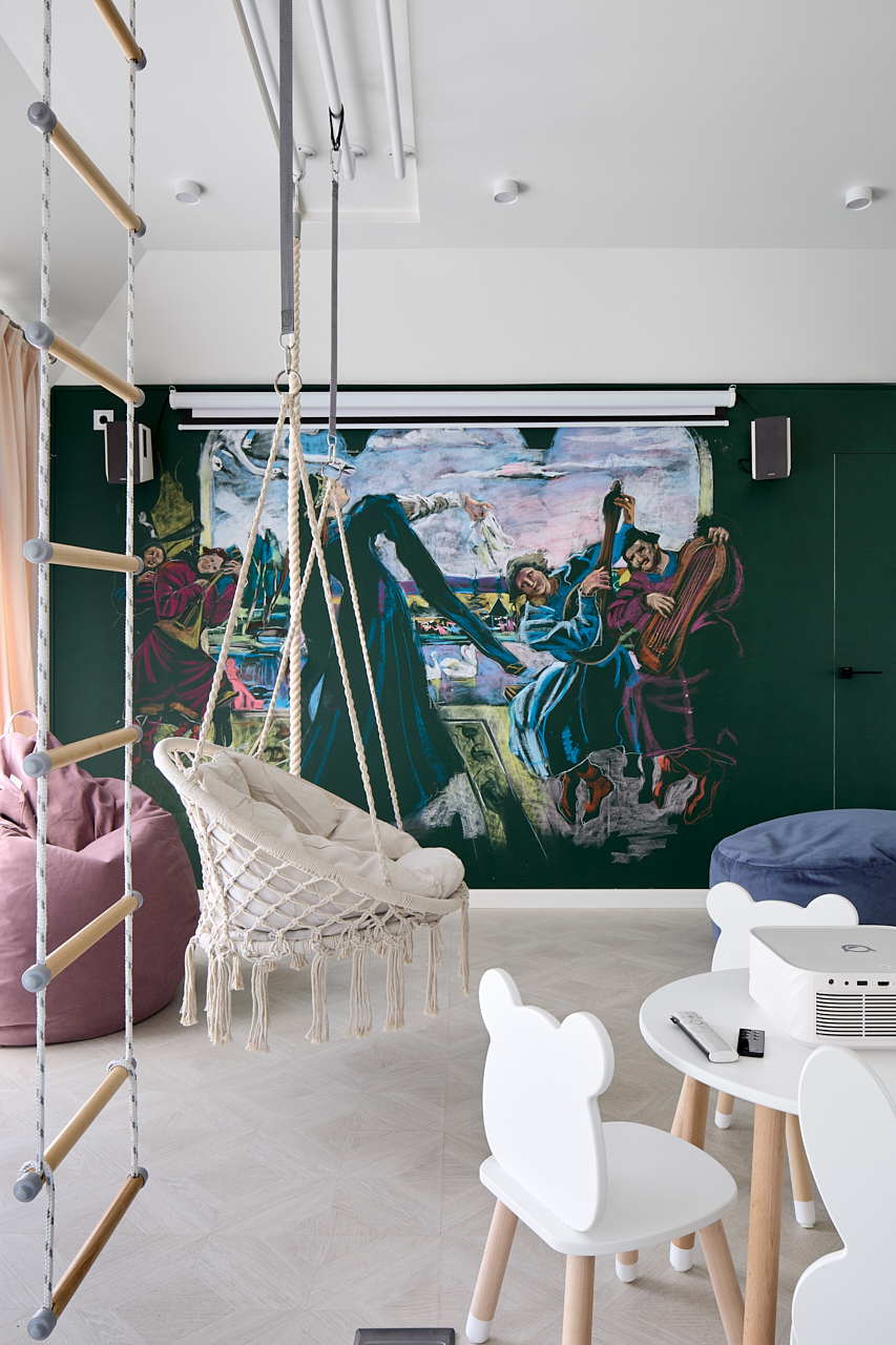 В основу концепции проекта легли мотивы переосмысления русского зодчества и живописи. Автор проекта - Анна Доброковская создала многофункциональное пространство с тремя основными зонами: спальная, рабочая и игровая. Дети могут как объединить три зоны, так и уединиться в одной из них.