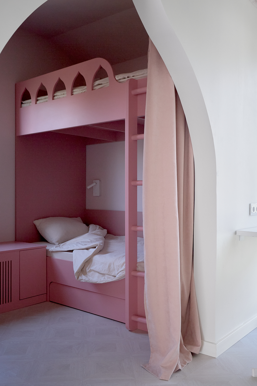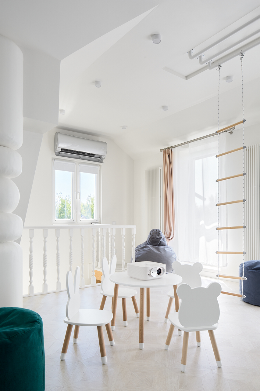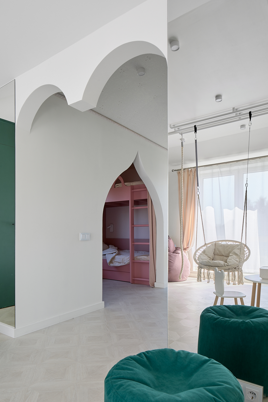 В основу концепции проекта легли мотивы переосмысления русского зодчества и живописи. Автор проекта - Анна Доброковская создала многофункциональное пространство с тремя основными зонами: спальная, рабочая и игровая. Дети могут как объединить три зоны, так и уединиться в одной из них.