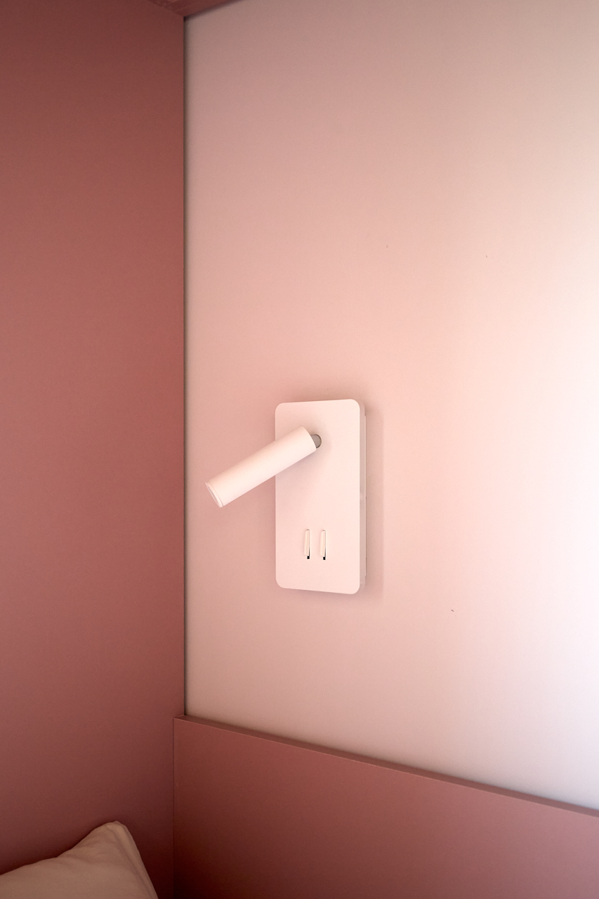 Для освещения над кроватями выбрали функциональный настенный светильник Arte Lamp ELECTRA A8233AP-1WH с двумя источниками света. Корпус с LED подсветкой по периметру создает парящий эффект. Спот с поворотным механизмом вращается в разные стороны. Кнопки на корпусе позволяют управлять источниками света по отдельности.