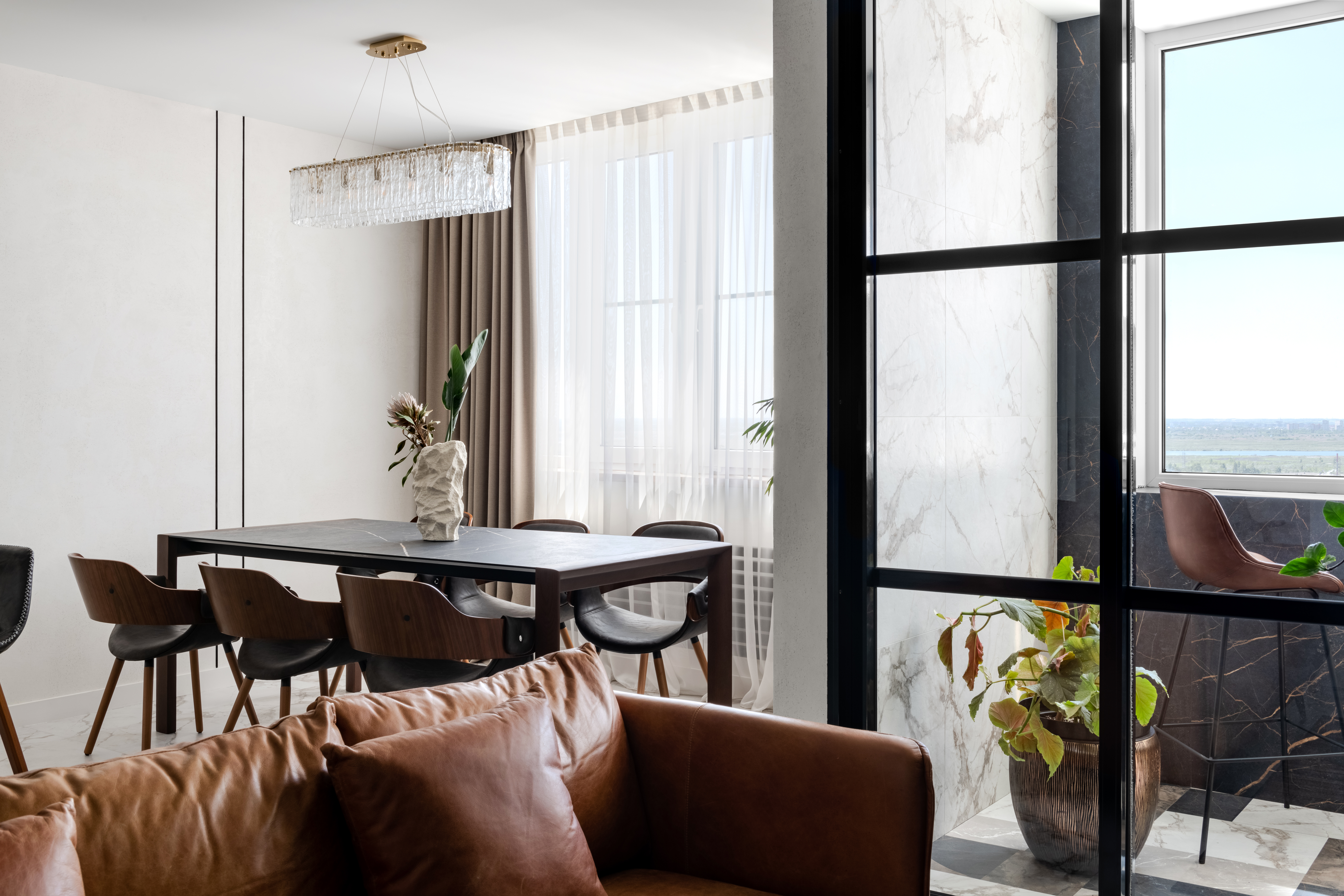 Квартира находится в элитном ЖК на берегу реки Дон и состоит из двух объединенных квартир. Из студии сделали кухню-гостиную, в которой может поместиться не только семья, а и многочисленные гости. В большой квартире выделили прихожую, мастер-спальню, кабинет и детскую, таким образом отделив зону отдыха.
