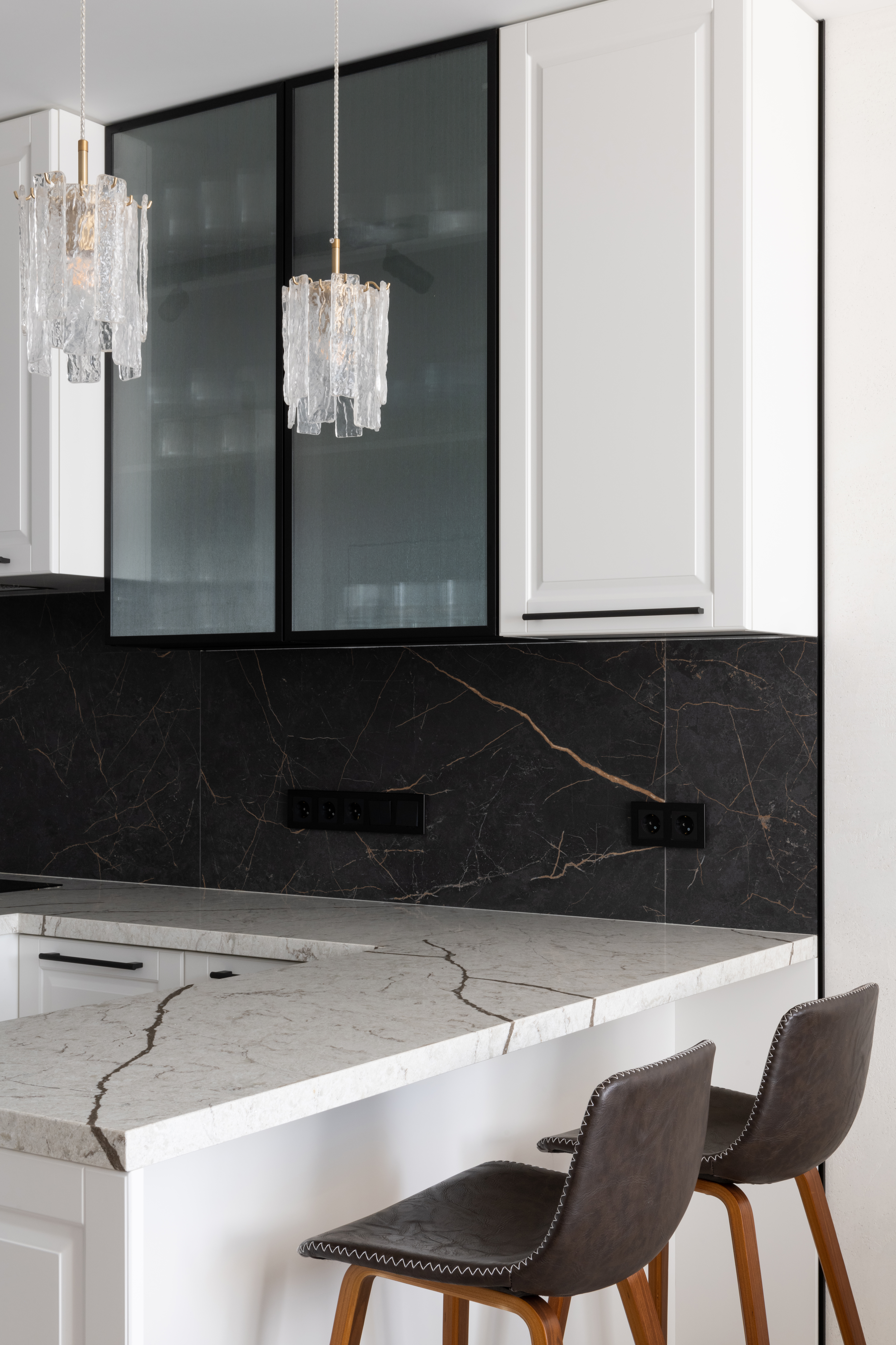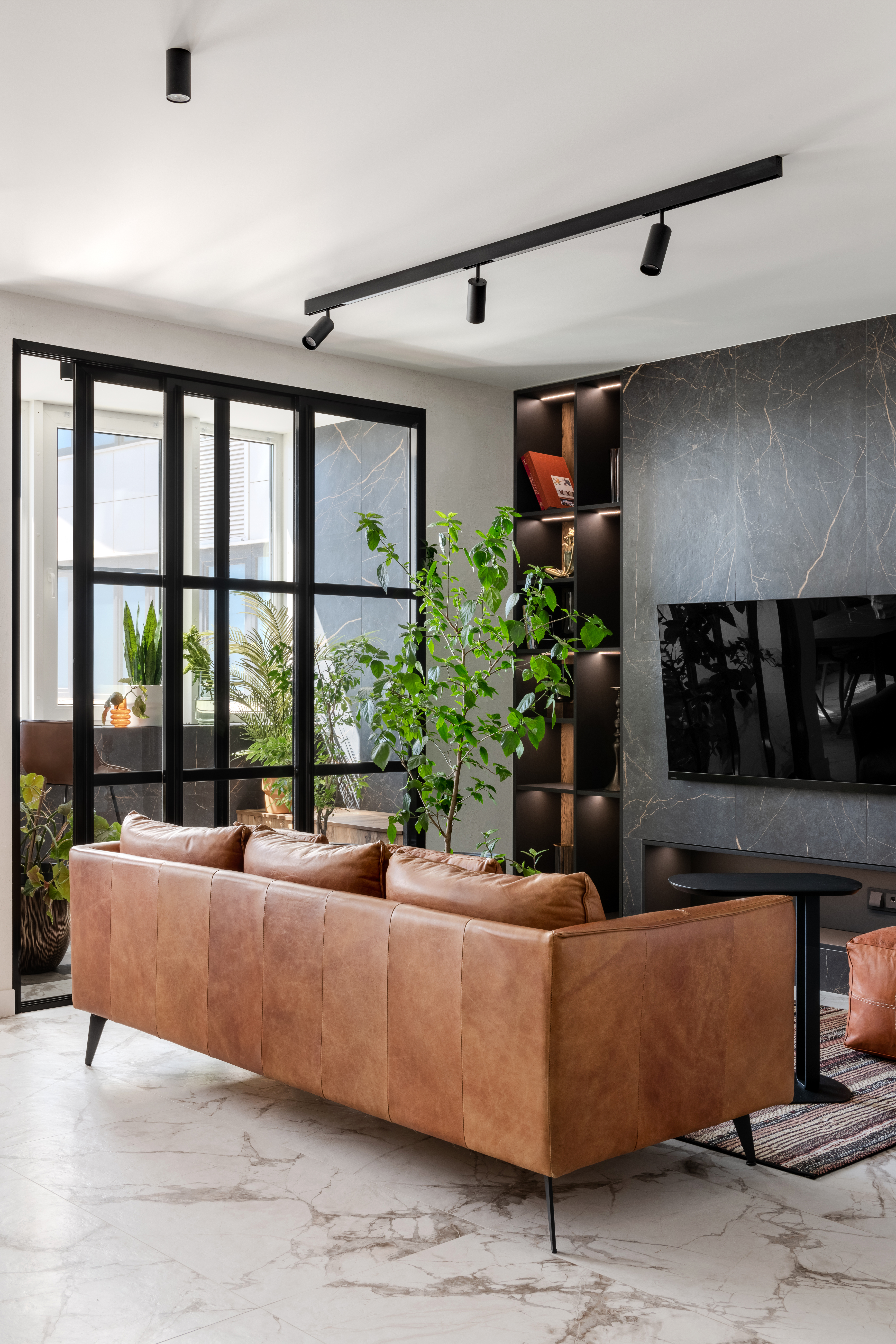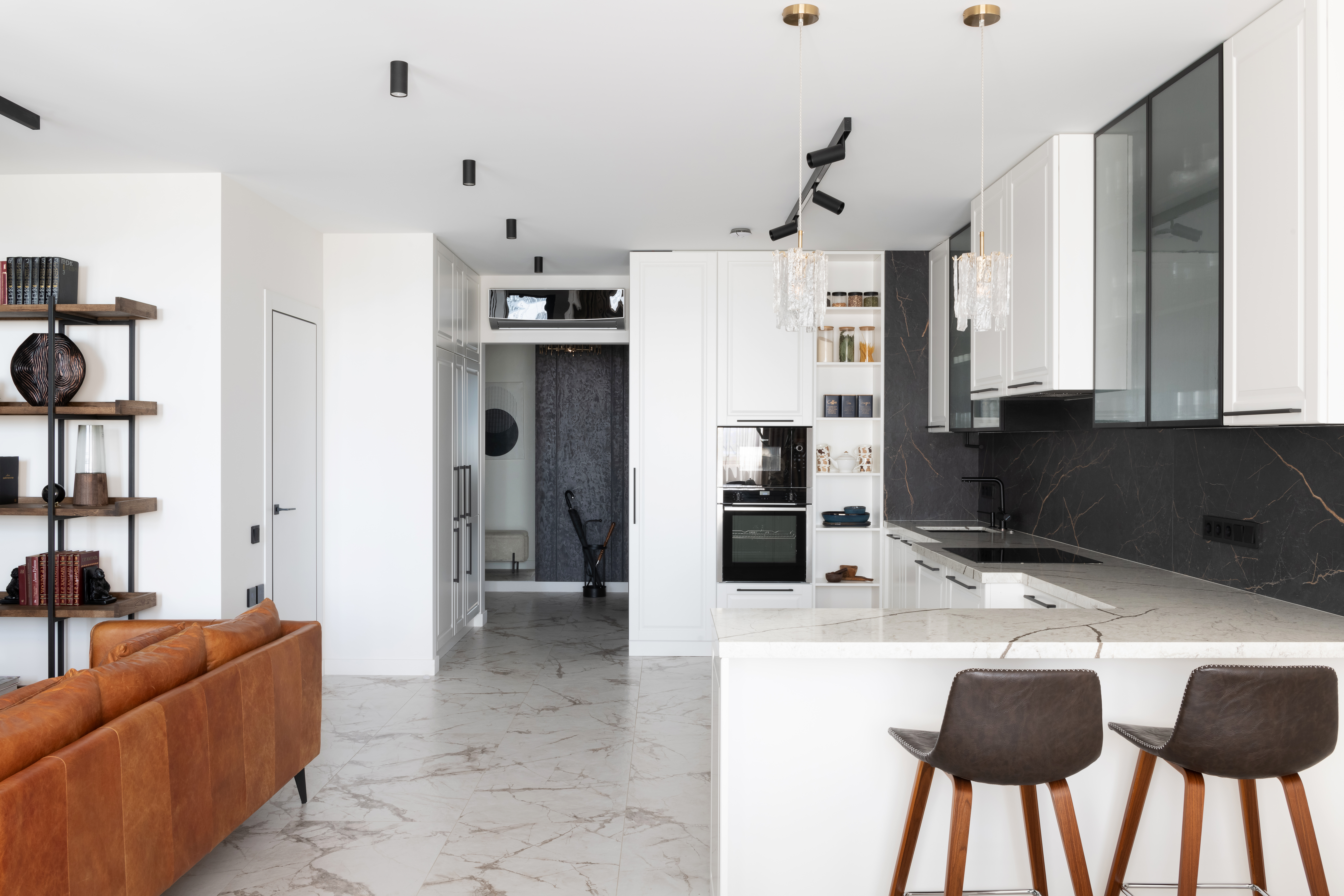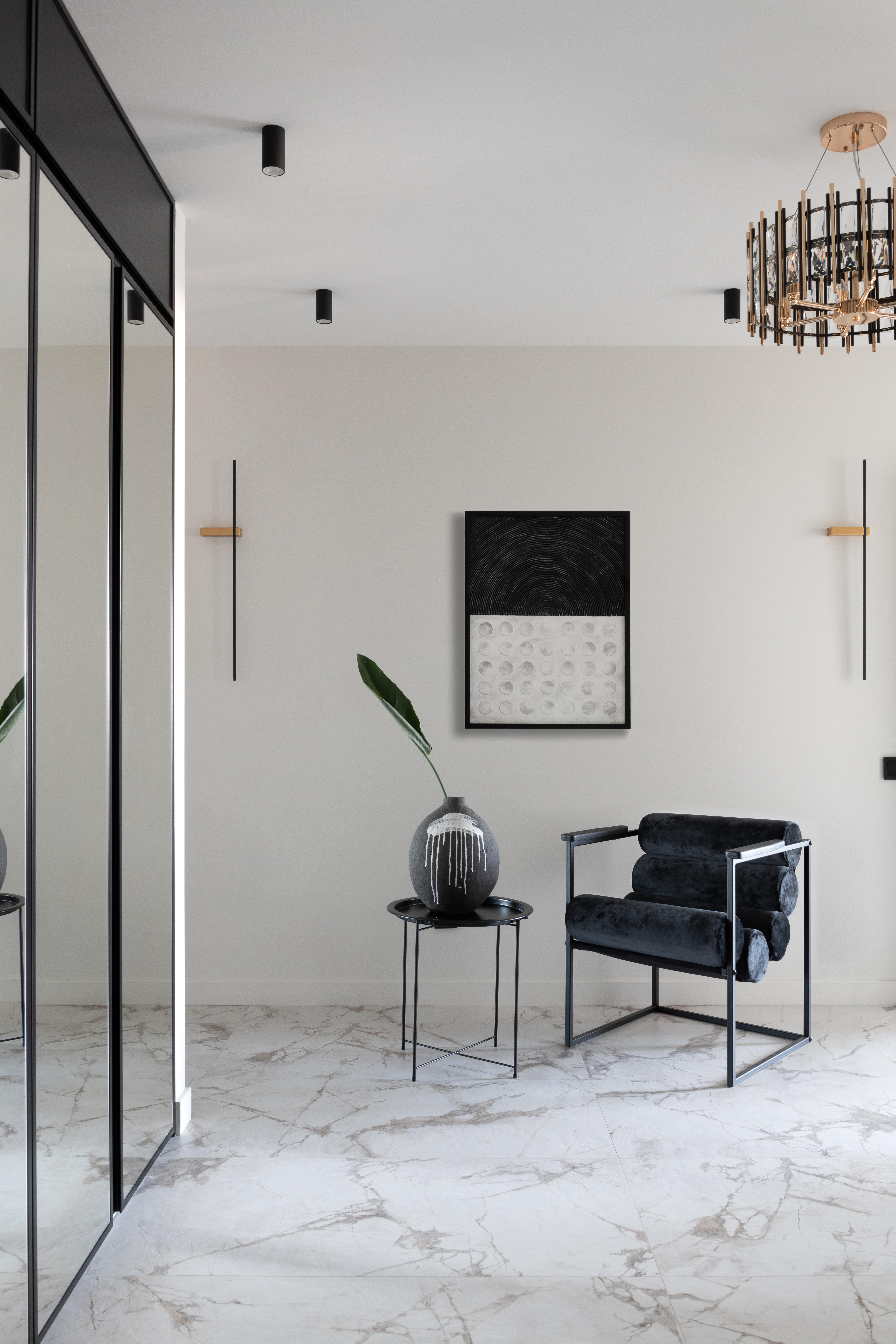 «Здесь проживает молодая семейная пара с двумя детьми. Интерьер получился лаконичным, современным, с элементами неоклассики. Керамогранит под мрамор использовали не только на полу, в санузлах, кухонном фартуке, но и в отделке стены в спальне. Высота потолка была небольшой — 2.6 м, поэтому мы "вытягивали" стены вертикальными линиями: черным профилем и зеркальными вставками».