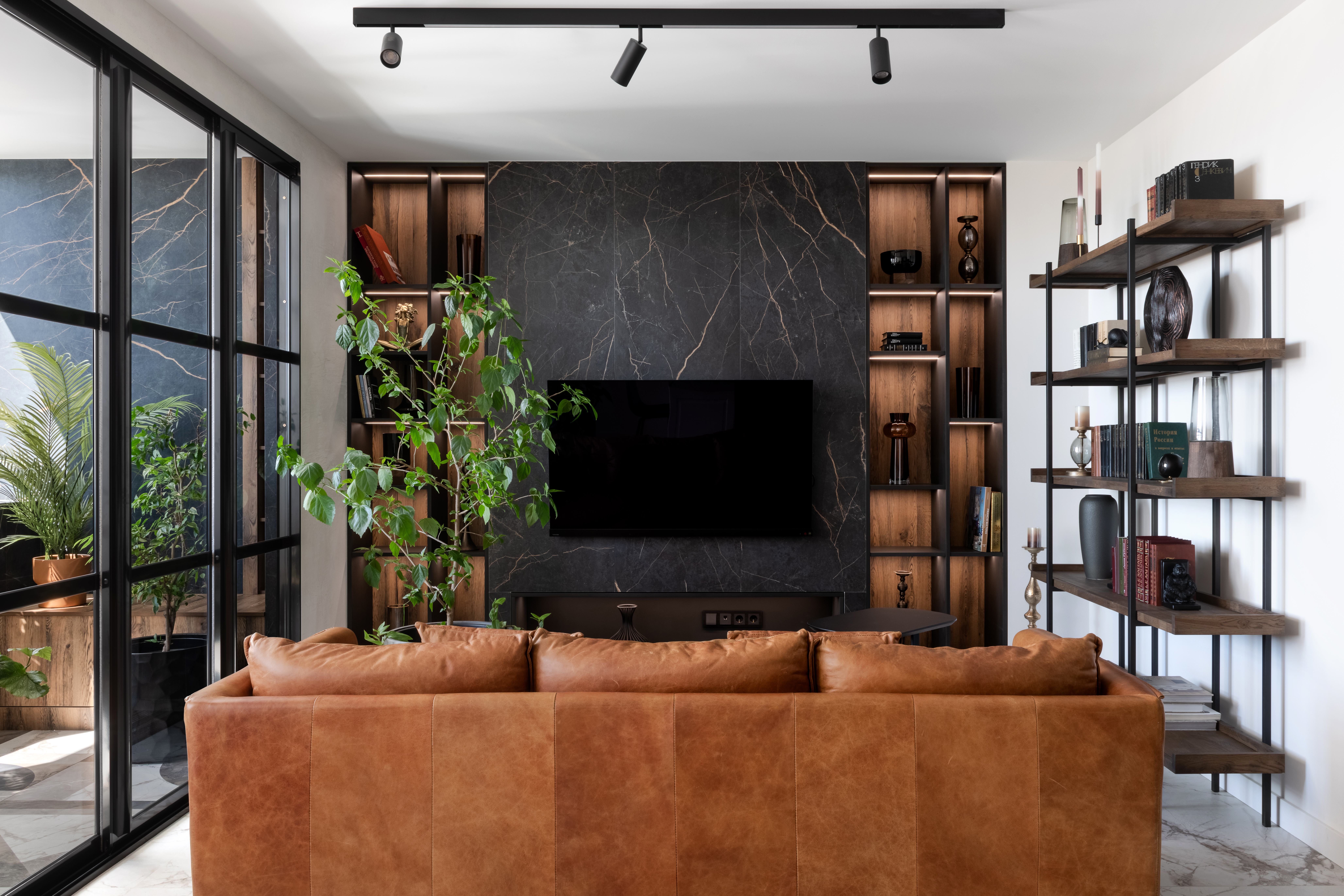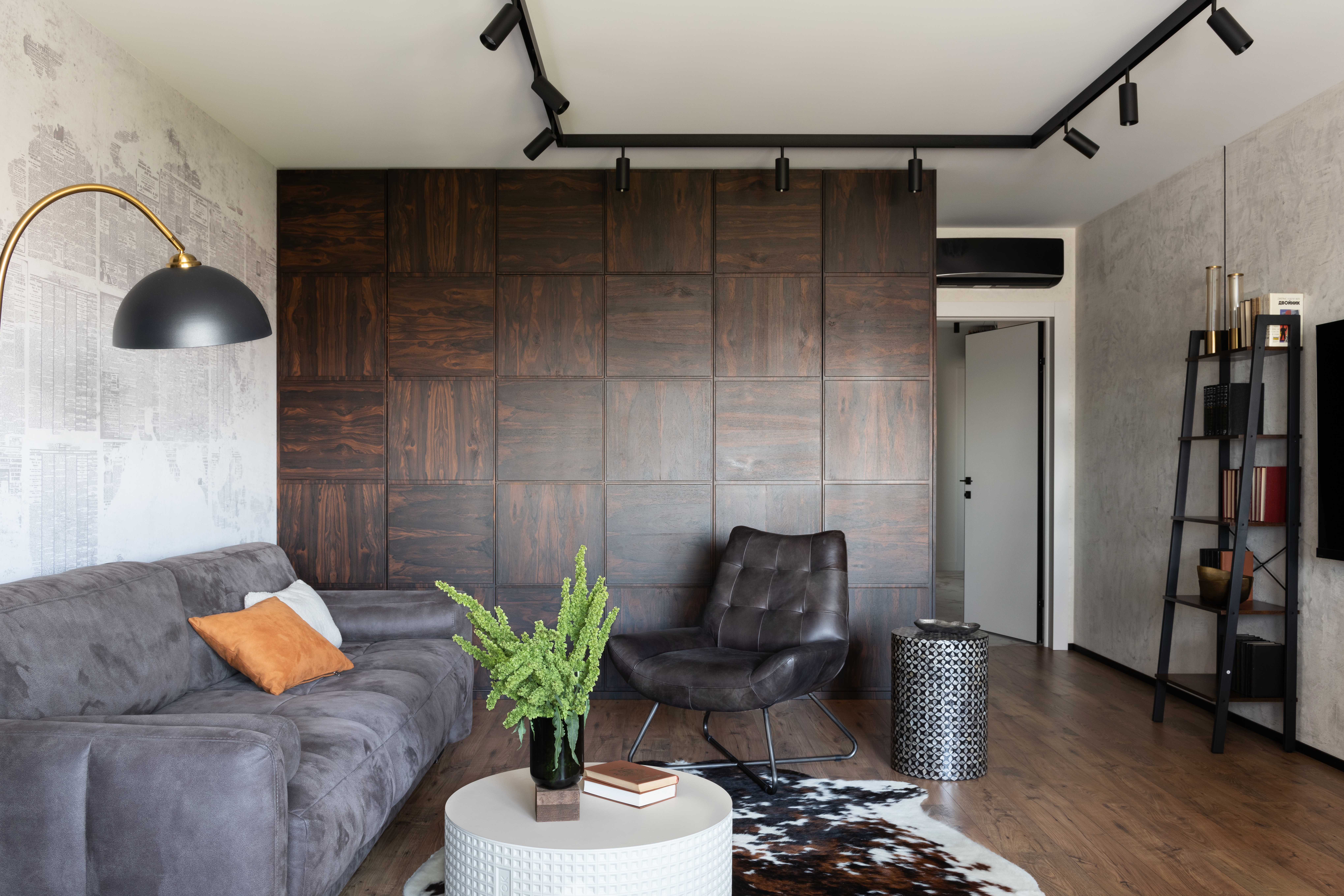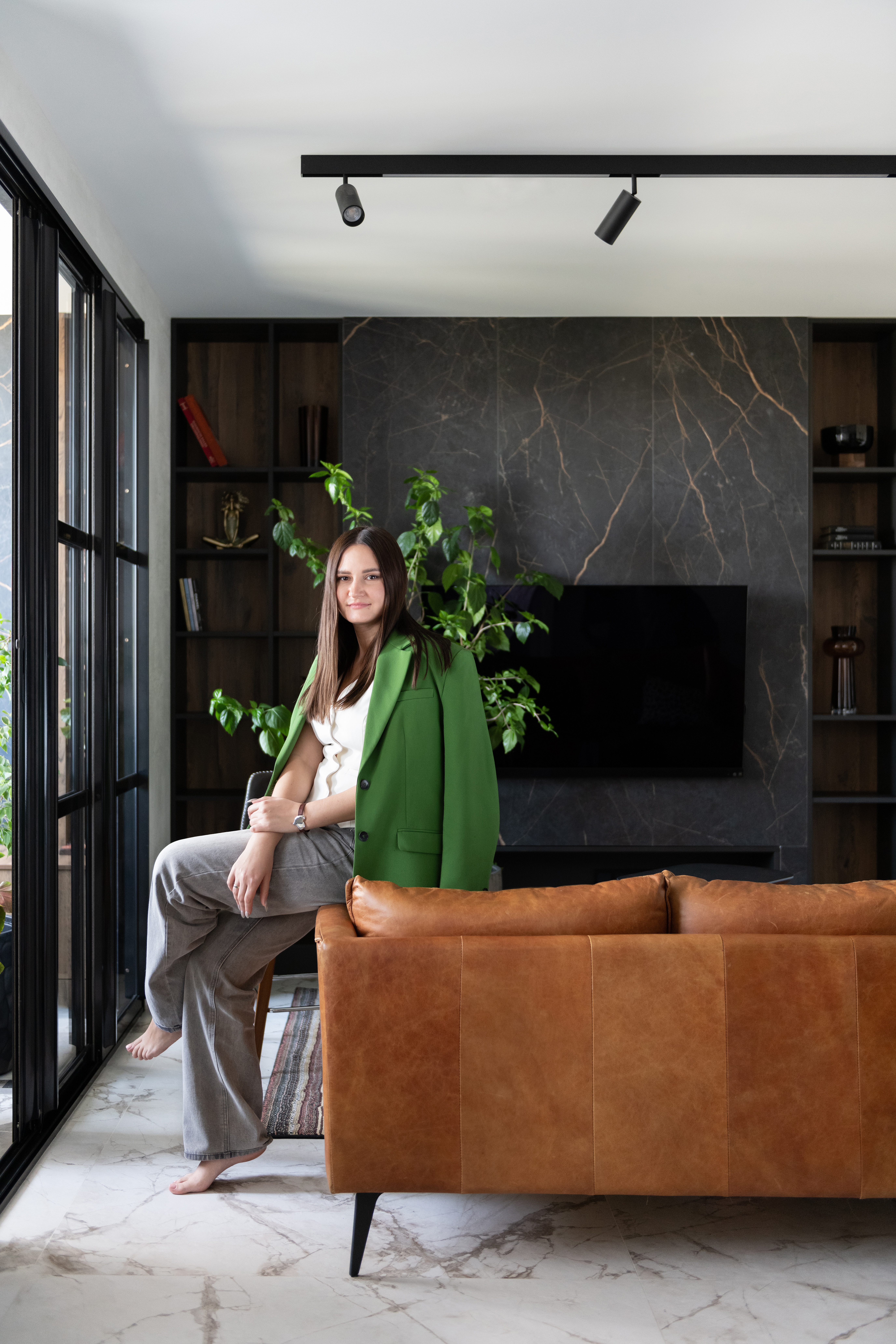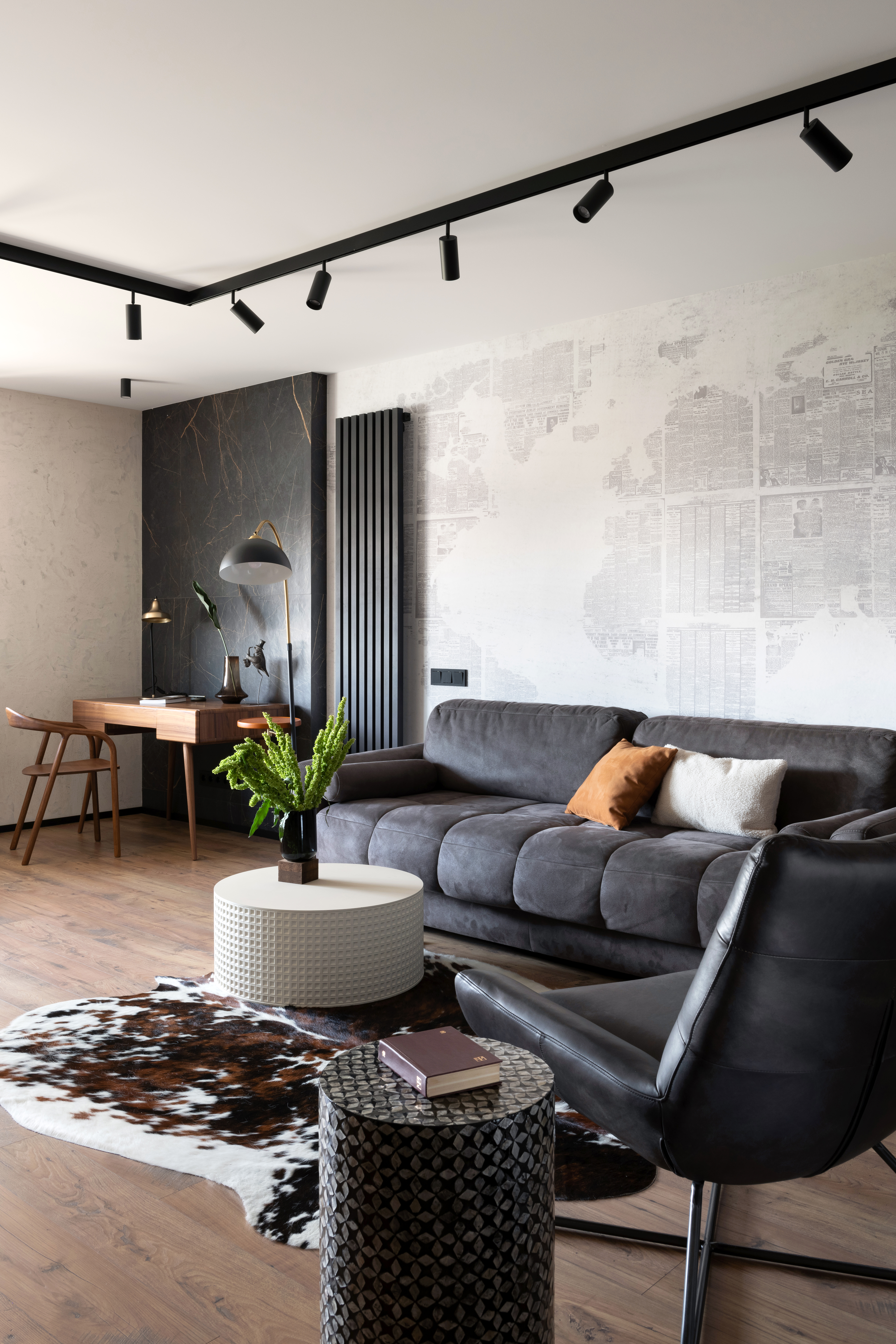 «Здесь проживает молодая семейная пара с двумя детьми. Интерьер получился лаконичным, современным, с элементами неоклассики. Керамогранит под мрамор использовали не только на полу, в санузлах, кухонном фартуке, но и в отделке стены в спальне. Высота потолка была небольшой — 2.6 м, поэтому мы "вытягивали" стены вертикальными линиями: черным профилем и зеркальными вставками».